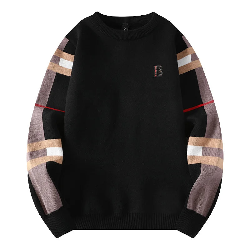 Premium knit sweater features striking contrast sleeves adorned with bold stripes and accent detailing, seamlessly blending classic charm with contemporary edge.